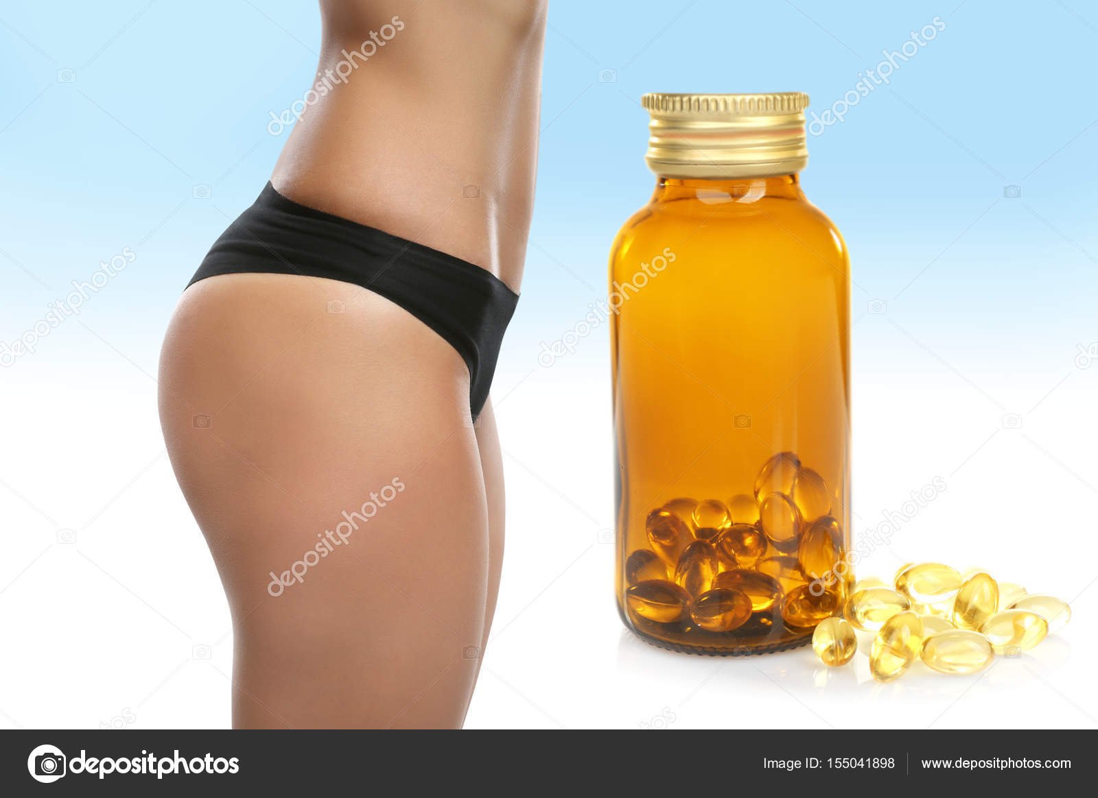 Concept Of Fish Oil For Weight Loss Slim Young Woman Measuring